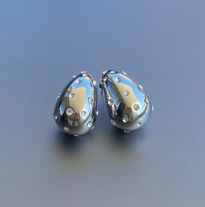 A unique twist of the iconic earrings with their water droplet design, this crystal studded pair is the ultimate head-turner. Rhodium plated, with a mirror finish, these drops have a timeless appeal and can effortlessly elevate any outfit.