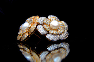 A pair of classic pavé-set flower earrings, handcrafted in fine silver and 24K yellow gold & rhodium plated, featuring natural pearls and stones.